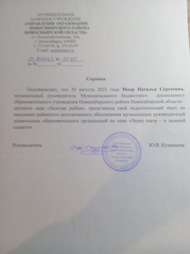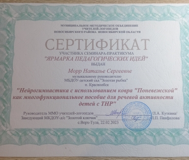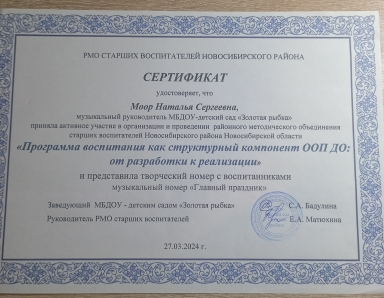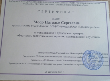 Районное методическое объединение воспитателей групп раннего дошкольного возраста, старших воспитателей Новосибирского района. Сертификат за организацию и проведение ярмарки педагогических практик