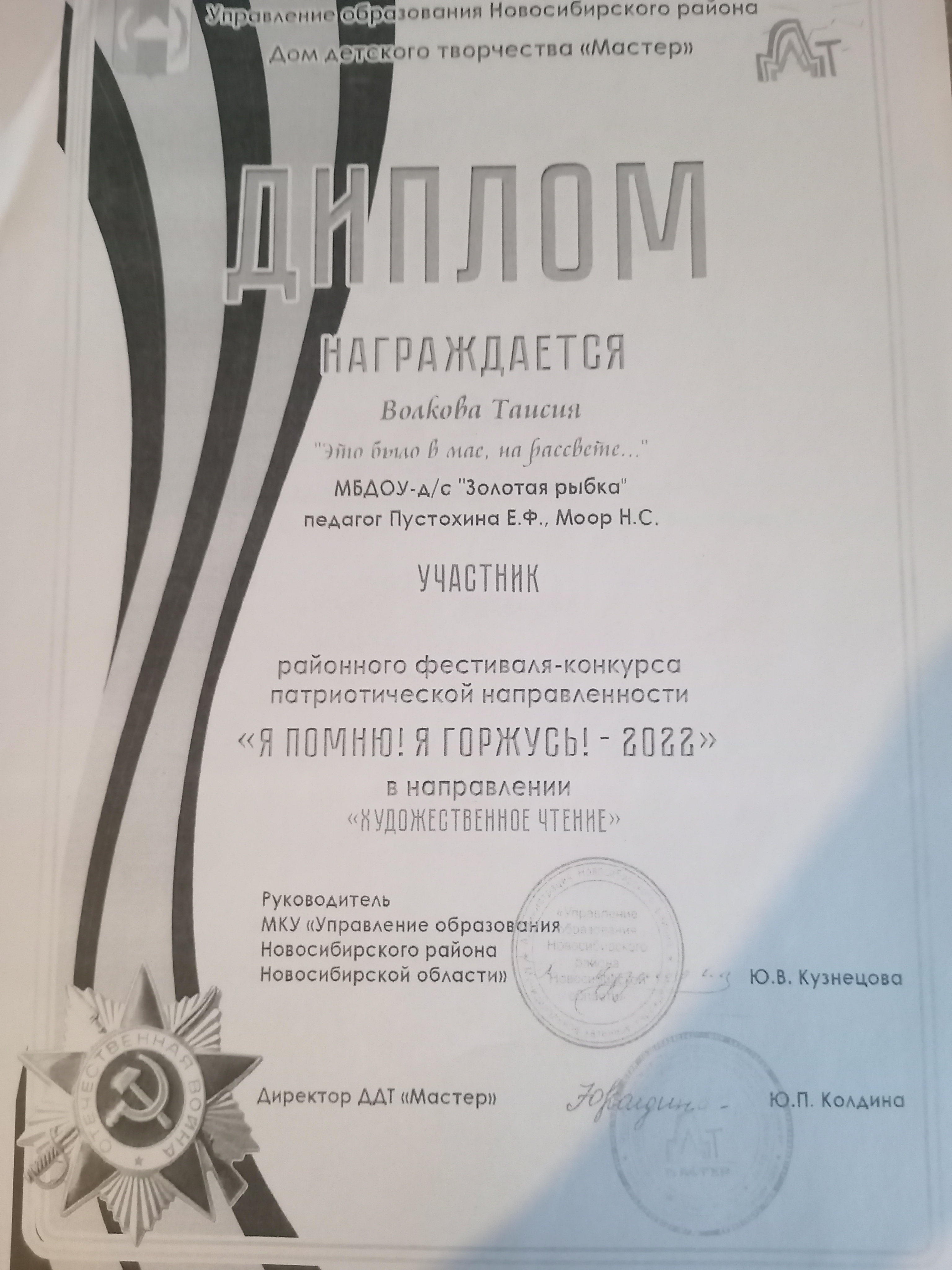 Управление образования Новосибирского района ДДТ "Мастер" Фестиваль-конкурс патриотической направленности "Я помню!Я горжусь!-2022"